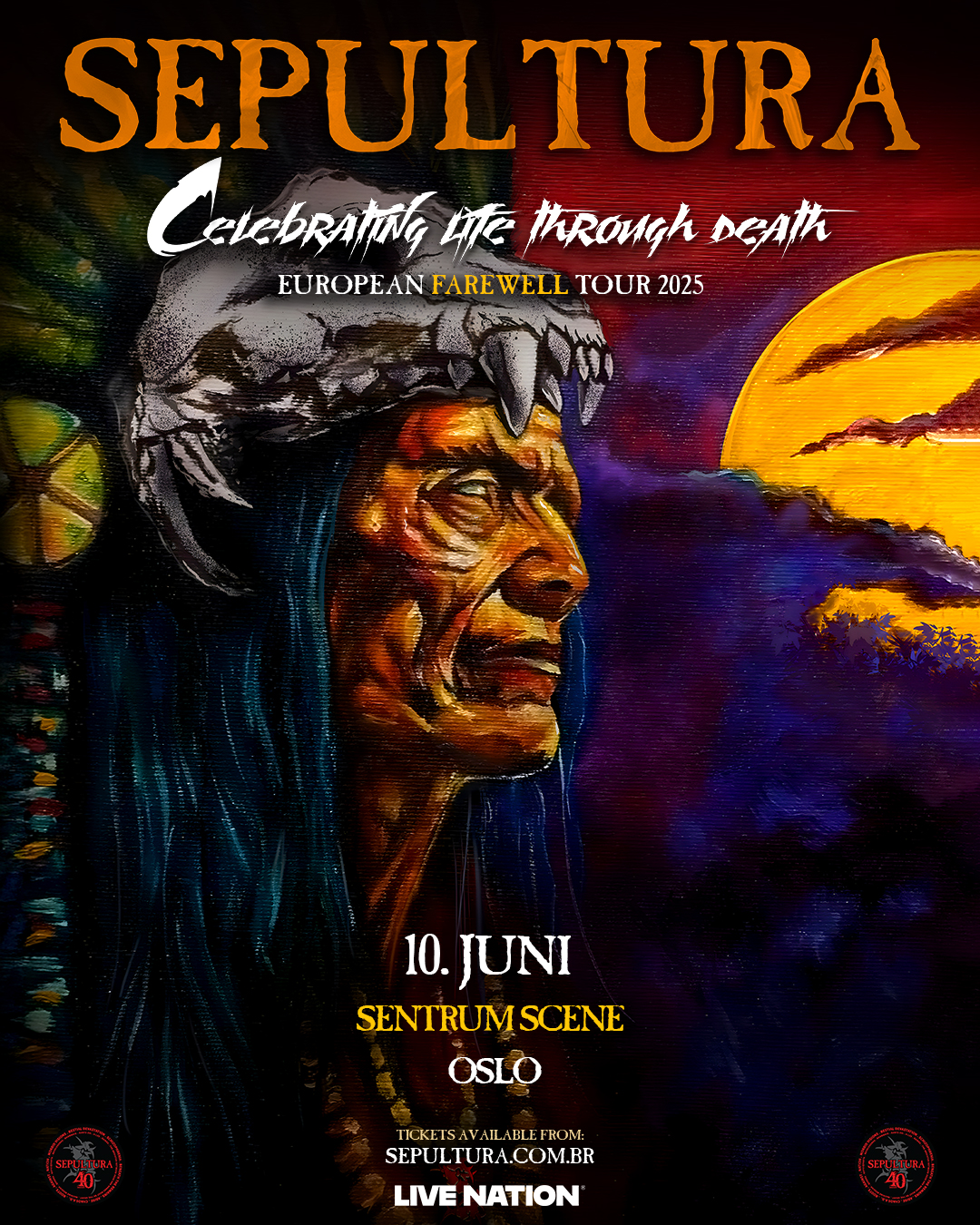 Det legendariske brasilianske metalbandet Sepultura har annonsert at de gir seg, men heldigvis besøker de Oslo én siste gang. Celebrating Life Through Death-turneen tar bandet til Sentrum Scene tirsdag 10. juni, og de vil spille låter fra hele sin triumferende førti år lange karriere.